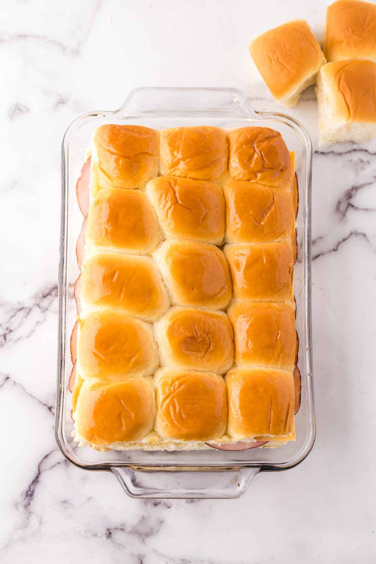 - Place the bottom sheet of rolls in the baking sheet and top them with 6 slices of American cheese and 8 slices of deli ham. Top the ham with 6 more slices of cheese and the other half of the rolls.