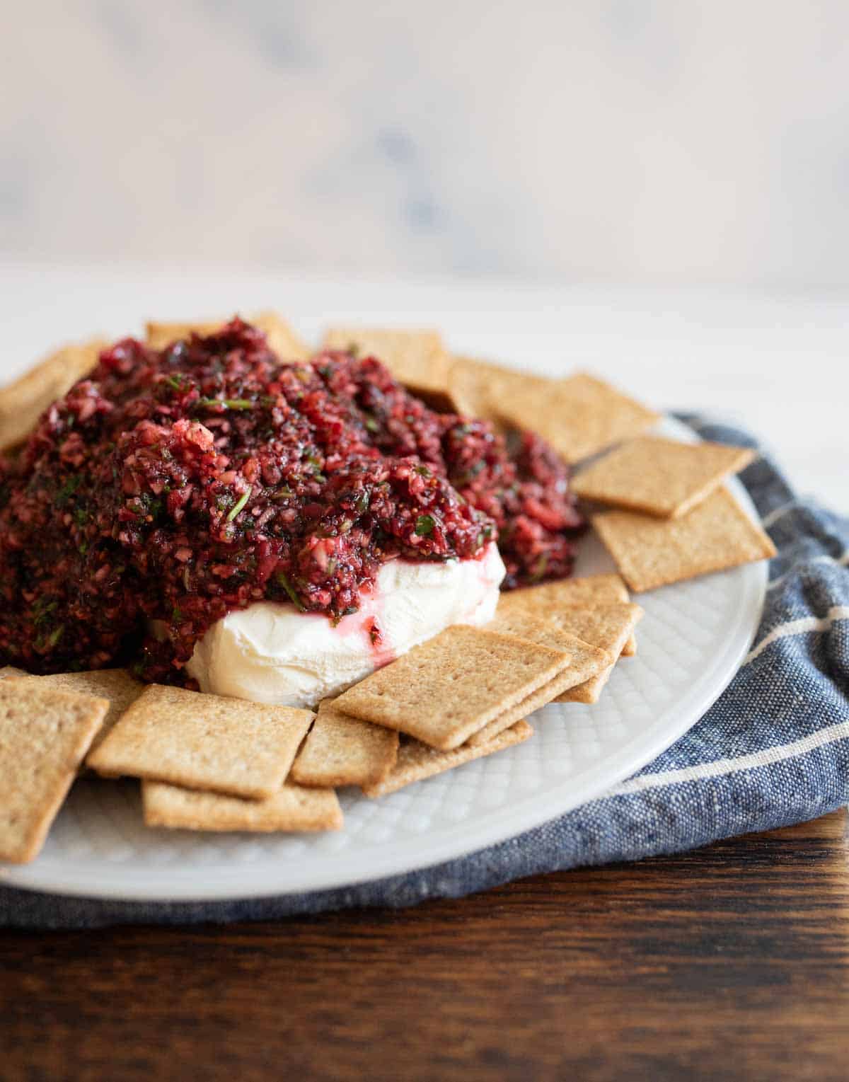 To make this dish party-perfect, prepare the cranberry mixture up to 24 hours ahead, but assemble just before guests arrive, giving the cream cheese about 30 minutes to come to room temperature for the best flavor and texture.