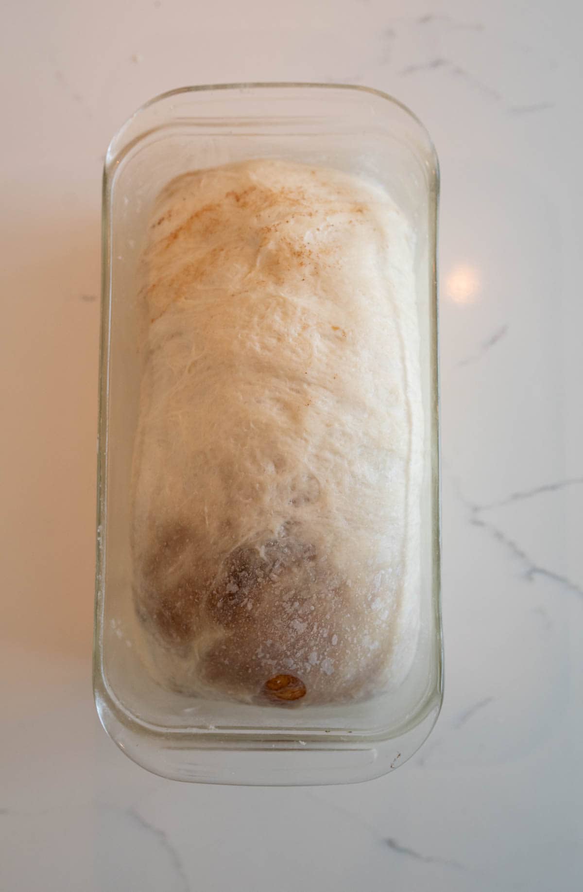 - Cover and allow the loaf to rise for 1-3 hours or until it reaches about ½ inch above the pan’s rim.