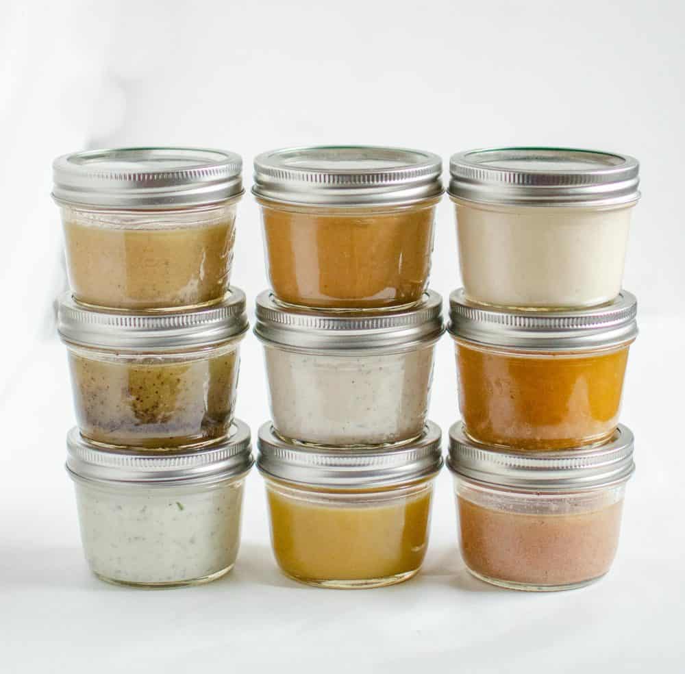 The dressings store well in wide-mouth half-pint mason jars. These lids are also really nice to have on hand! Each recipe only makes about a cup, which is great if you ask me.