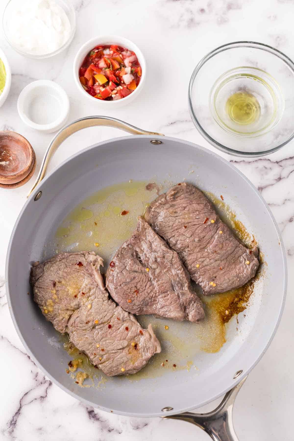 - After marinating the steak, cook it in a pan over medium-high heat for about 8 minutes, or until it reaches an internal temperature of 160°F.