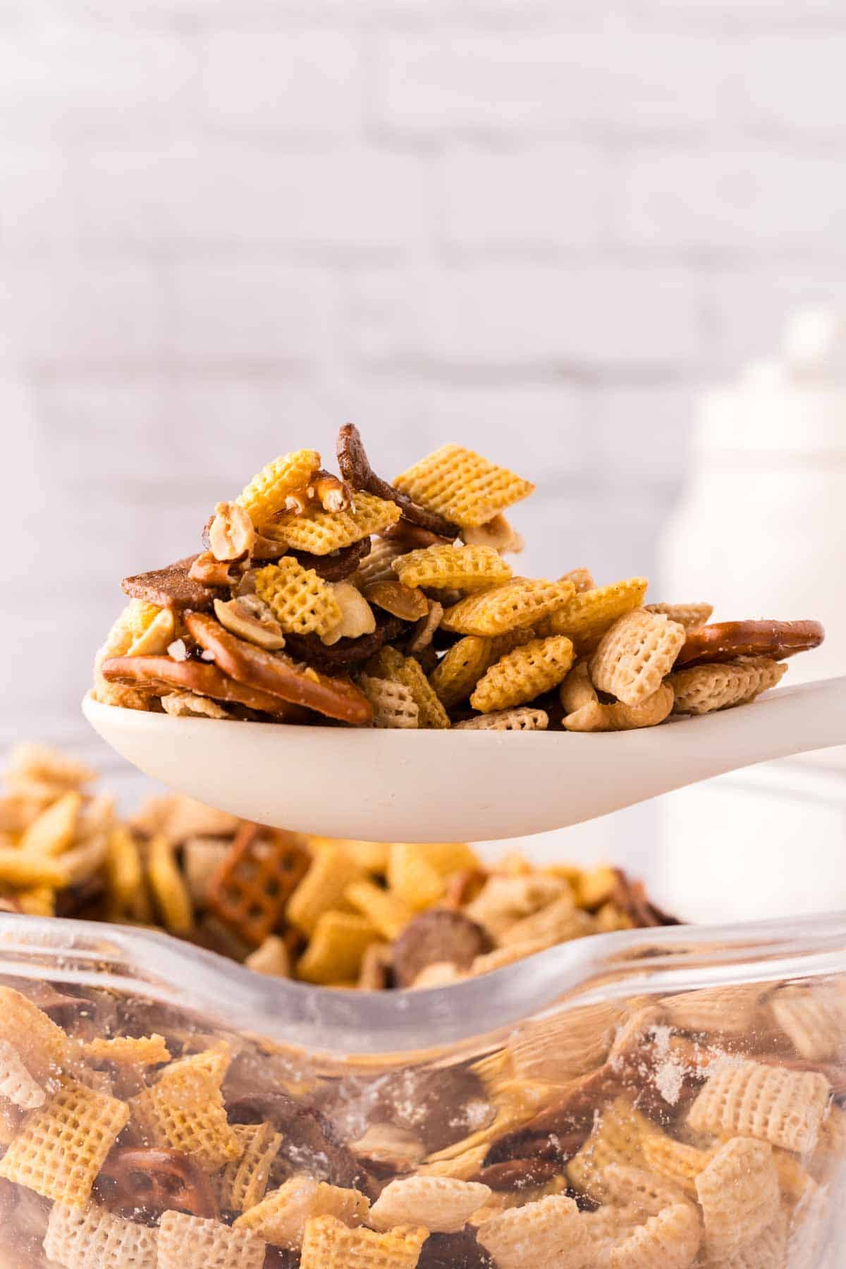 One of the best things about this recipe is how easy it is to store. Chex mix will store nicely on your counter in a plastic container with a tight lid or in a ziplock bag. When stored properly, your Chex Mix will be good for about a week before it starts to get stale. You can also store your leftovers in sandwich bags for an easy grab-and-go snack.