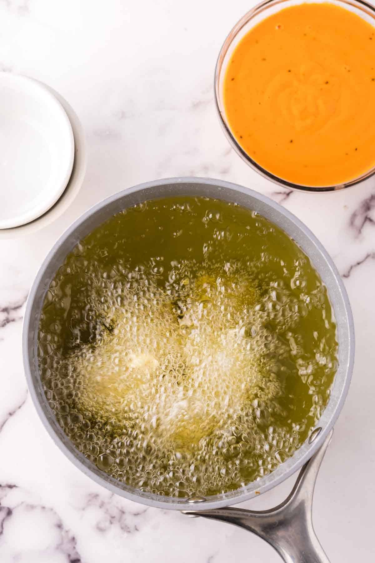Your cauliflower wings might have become soggy if the cauliflower was still wet before dipping it into the batter, or the oil was not hot enough. Before you start cooking the cauliflower, it is important that you pat it dry. This will also help the batter adhere better. We like to use a candy thermometer to check the temperature of our oil and ensure it is around 350°F. Another easy way to check your oil temperature is to stick a wooden spoon in your pot until it reaches the bottom. If you see small bubbles forming around the handle of the spoon, you know the oil is ready.