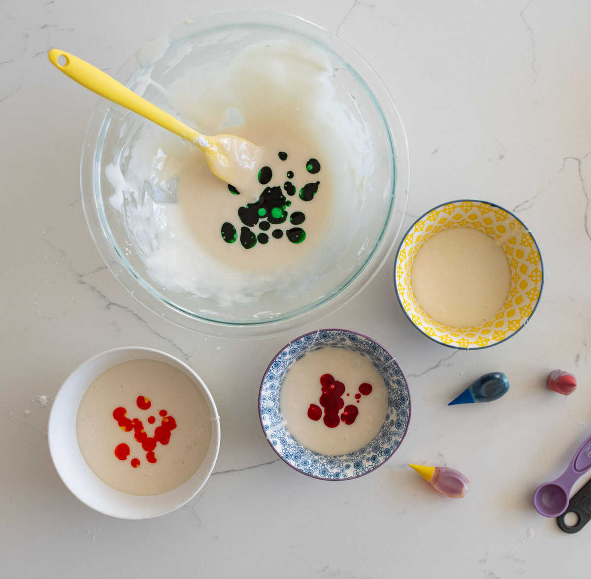 Step 2: Once the consistency is the right thickness for your use, separate into multiple bowls and add your choice of food colorings.