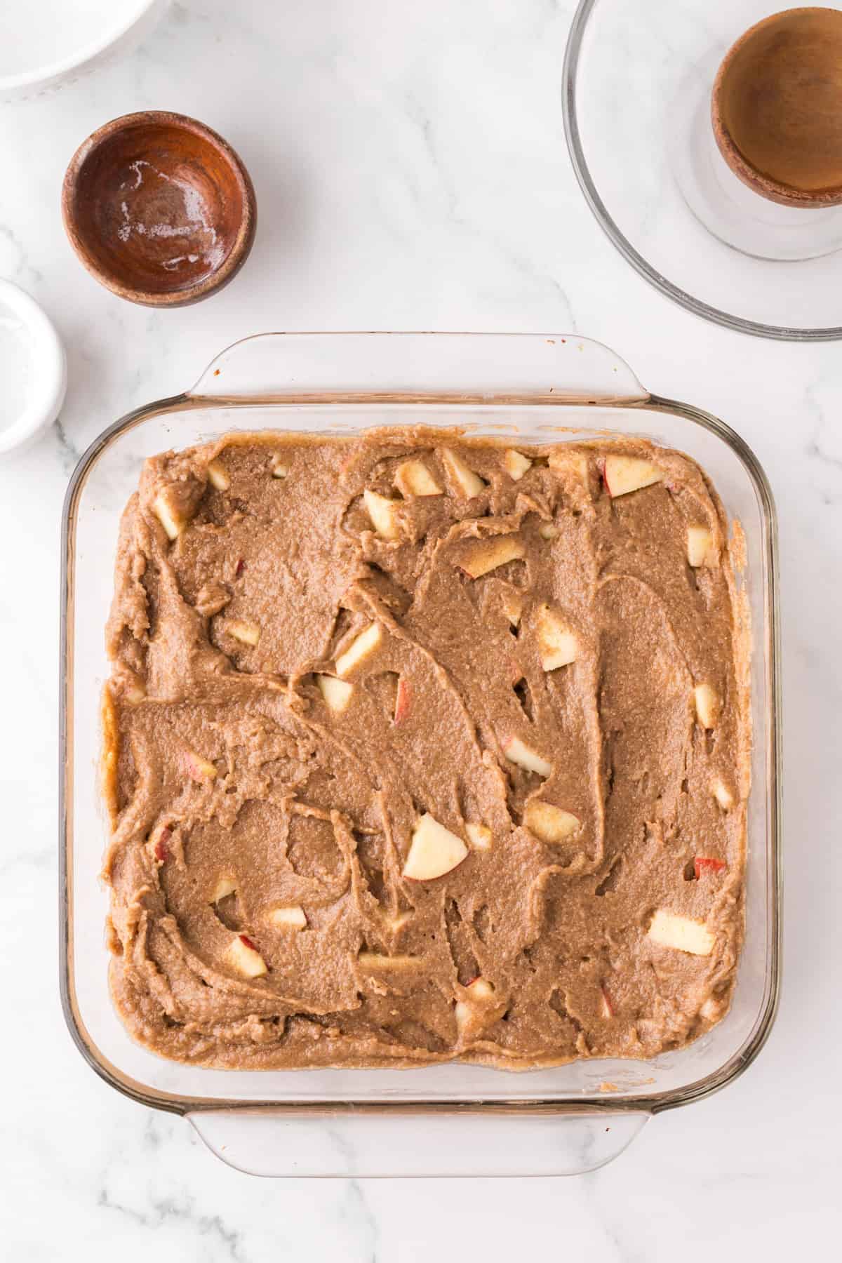 Step #3. Fold in the apples. Pour batter into a greased baking pan.