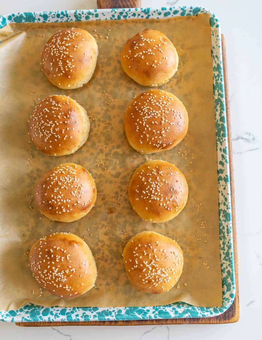 - Remove from the oven, and let the buns cool 10 to 15 minutes minimum before slicing in half and serving with your favorite burger, pulled pork, or just about any other sandwich toppings.